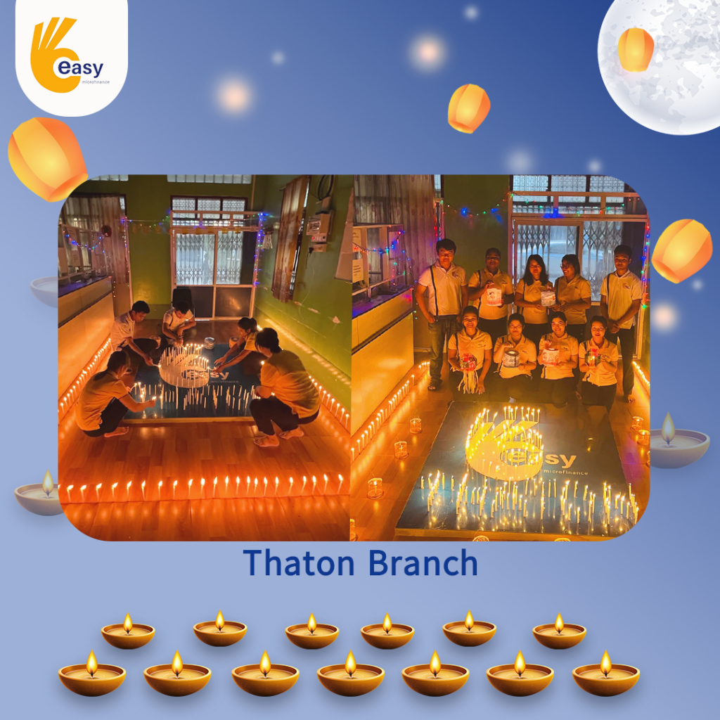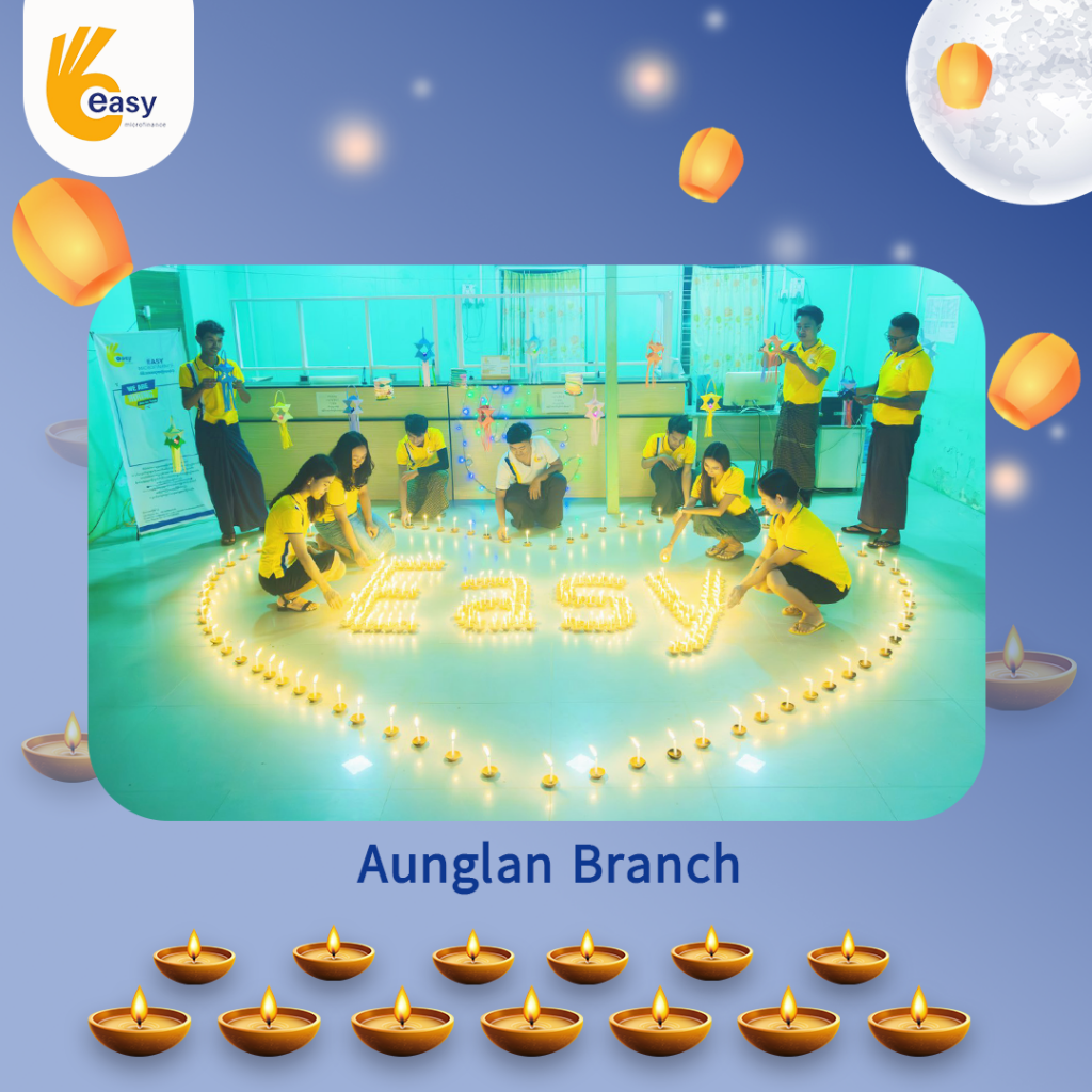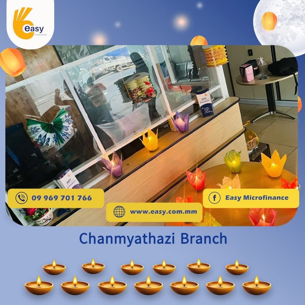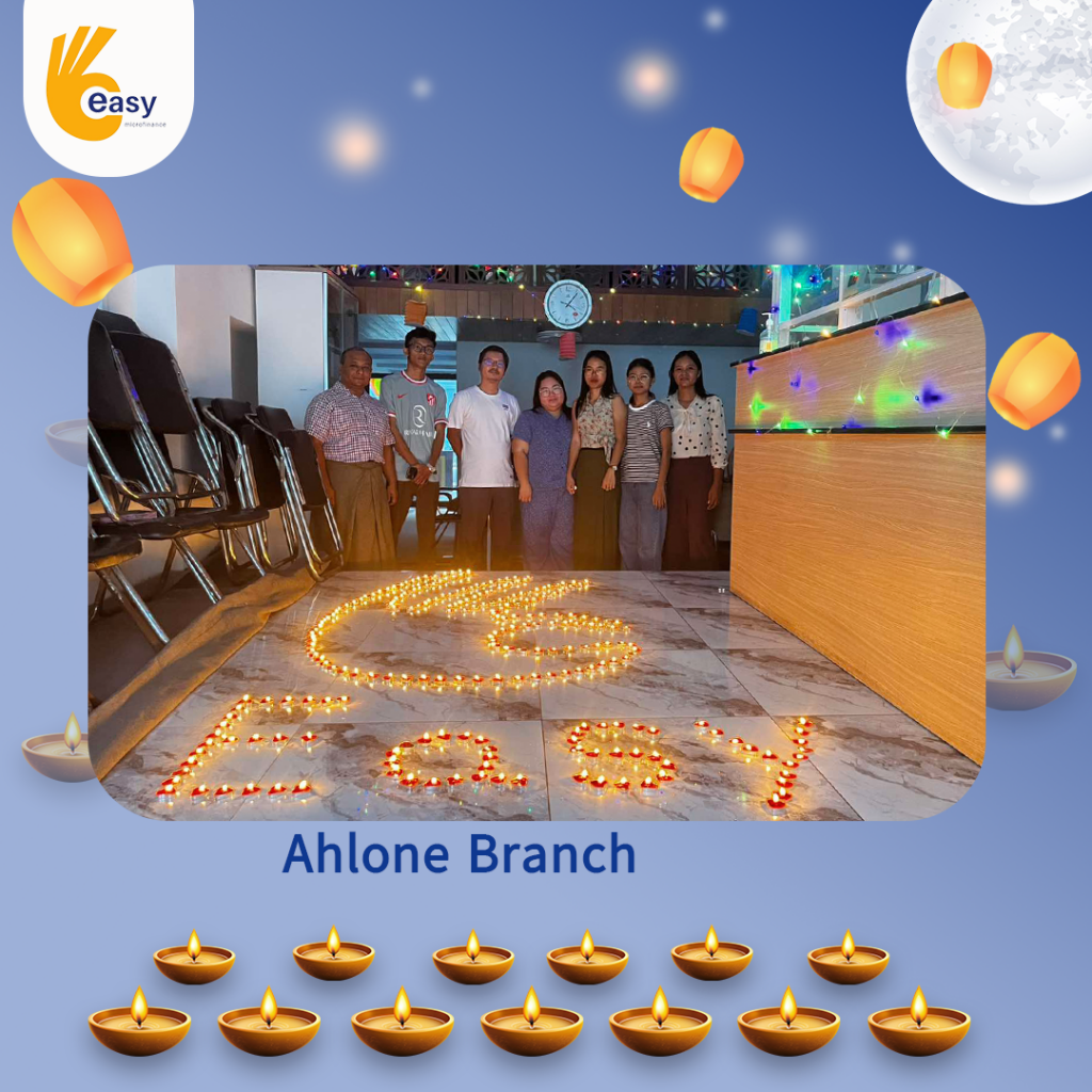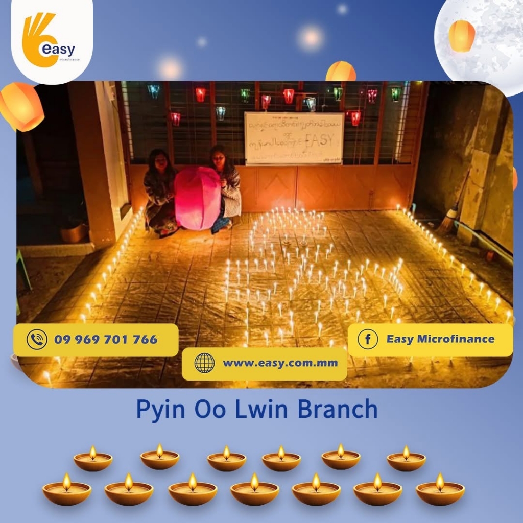 Easy Microfinance မှ စီစဥ်ကျင်းပသည့် ” ပျော်ရွှင်ဆင်နွှဲ Easy ၀န်ထမ်း များ၏ သီတင်းကျွတ်မီးထွန်းပွဲ” အစီအစဥ်လေးမှာတော့ မြန်မာနိုင်ငံအတွင်းရှိ Easy Microfinance ရုံးခွဲအသီးသီးမှ Regional Manager များ၊ Branch Manager များနှင့်အတူ ဝန်ထမ်းများမှ စုပေါင်းကာ သီတင်းကျွတ်ဆီမီးထွန်းညှိခြင်းပုံရိပ်များဖြင့် မိမိတို့၏ Branch အလိုက် အလှပဆုံးပုံဖော်ရိုက်ကူးကာ ပျော်ရွှင်စွာပါဝင်ဆင်နွှဲခဲ့ကြသည့် ပုံရိပ်များကို တင်ဆက်ပေးလိုက်ပါသည်။ အလှပဆုံး ပုံဖော်ရိုက်ကူးနိုင်သည့် ရုံးခွဲများကို ဆုလက်ဆောင်များအသီးသီး ပေးအပ်သွားမှာဖြစ်သည့်အတွက် မိမိနှစ်သက်ရာ ရုံးခွဲဓာတ်ပုံများပေါ်တွင် reacted (like & Share) ပြုလုပ်ပြီး ပါဝင်အားဖြည့်ကာ အားလုံးနှင့် ထပ်တူရင်ခုန်စွာစောင့်မျှော်အားပေးကြဖို့ တိုက်တွန်းရင်း ယခုအစီအစဥ်လေးမှာပါဝင်ခဲ့ကြသည့် ရုံးခွဲအသီးသီးမှ တာဝန်ရှိသူများနှင့်ဝန်ထမ်း များအားလုံးကိုကျေးဇူးအထူးပင်တင်ရှိပါကြောင်းနှင့် ယခုလိုသီတင်းကျွတ်အခါသမယ မှစတင်ကာ နောက်လာမည့်နေ့ရက်များမှာလည်း ပိုမိုလှပသော အခိုက်အတန့်များစွာကို ရရှိပိုင်ဆိုင်နိုင်ပါစေကြောင်း ဆုမွန်ကောင်းတောင်းအပ်ပါသည်။