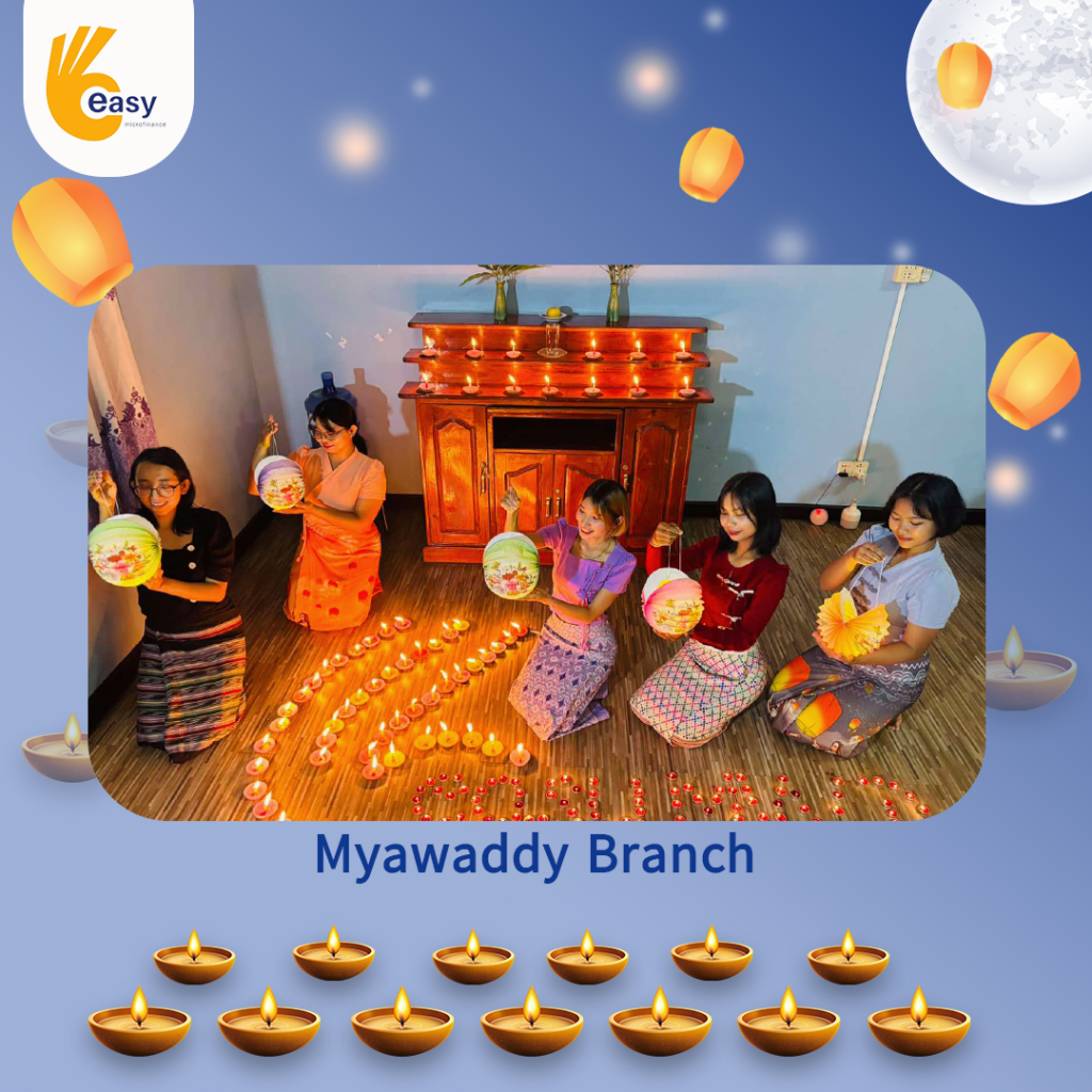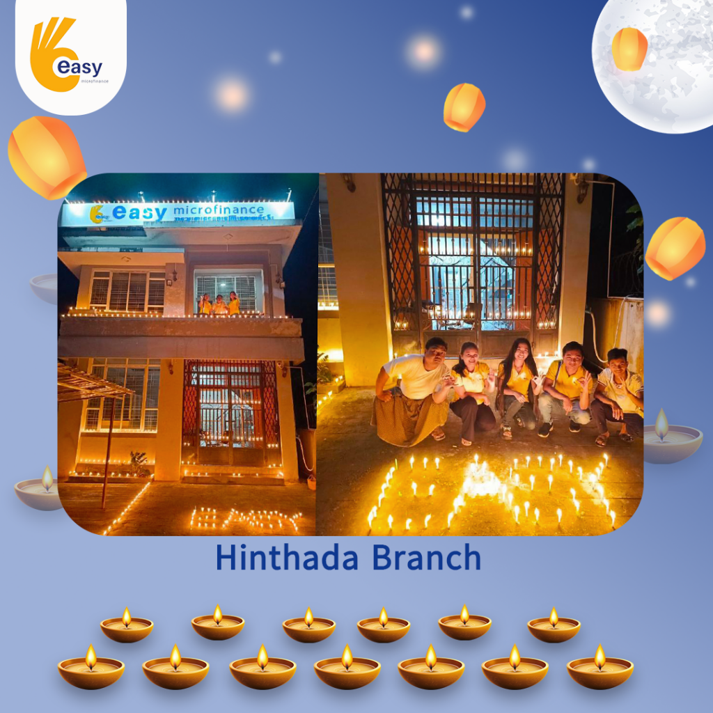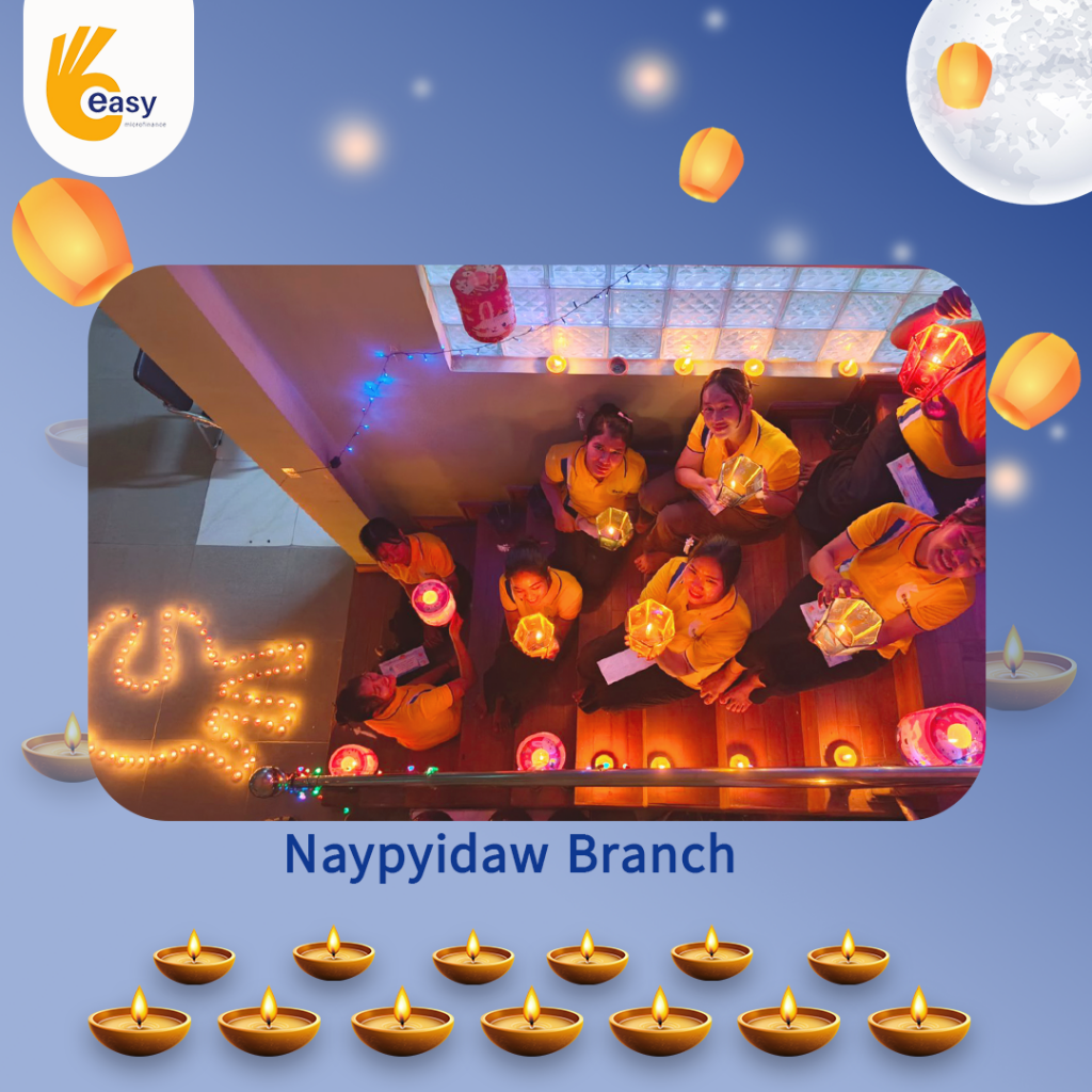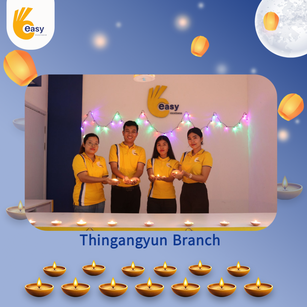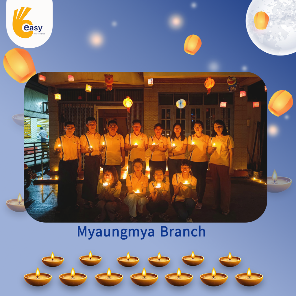 Easy Microfinance မှ စီစဥ်ကျင်းပသည့် ” ပျော်ရွှင်ဆင်နွှဲ Easy ၀န်ထမ်း များ၏ သီတင်းကျွတ်မီးထွန်းပွဲ” အစီအစဥ်လေးမှာတော့ မြန်မာနိုင်ငံအတွင်းရှိ Easy Microfinance ရုံးခွဲအသီးသီးမှ Regional Manager များ၊ Branch Manager များနှင့်အတူ ဝန်ထမ်းများမှ စုပေါင်းကာ သီတင်းကျွတ်ဆီမီးထွန်းညှိခြင်းပုံရိပ်များဖြင့် မိမိတို့၏ Branch အလိုက် အလှပဆုံးပုံဖော်ရိုက်ကူးကာ ပျော်ရွှင်စွာပါဝင်ဆင်နွှဲခဲ့ကြသည့် ပုံရိပ်များကို တင်ဆက်ပေးလိုက်ပါသည်။ အလှပဆုံး ပုံဖော်ရိုက်ကူးနိုင်သည့် ရုံးခွဲများကို ဆုလက်ဆောင်များအသီးသီး ပေးအပ်သွားမှာဖြစ်သည့်အတွက် မိမိနှစ်သက်ရာ ရုံးခွဲဓာတ်ပုံများပေါ်တွင် reacted (like & Share) ပြုလုပ်ပြီး ပါဝင်အားဖြည့်ကာ အားလုံးနှင့် ထပ်တူရင်ခုန်စွာစောင့်မျှော်အားပေးကြဖို့ တိုက်တွန်းရင်း ယခုအစီအစဥ်လေးမှာပါဝင်ခဲ့ကြသည့် ရုံးခွဲအသီးသီးမှ တာဝန်ရှိသူများနှင့်ဝန်ထမ်း များအားလုံးကိုကျေးဇူးအထူးပင်တင်ရှိပါကြောင်းနှင့် ယခုလိုသီတင်းကျွတ်အခါသမယ မှစတင်ကာ နောက်လာမည့်နေ့ရက်များမှာလည်း ပိုမိုလှပသော အခိုက်အတန့်များစွာကို ရရှိပိုင်ဆိုင်နိုင်ပါစေကြောင်း ဆုမွန်ကောင်းတောင်းအပ်ပါသည်။