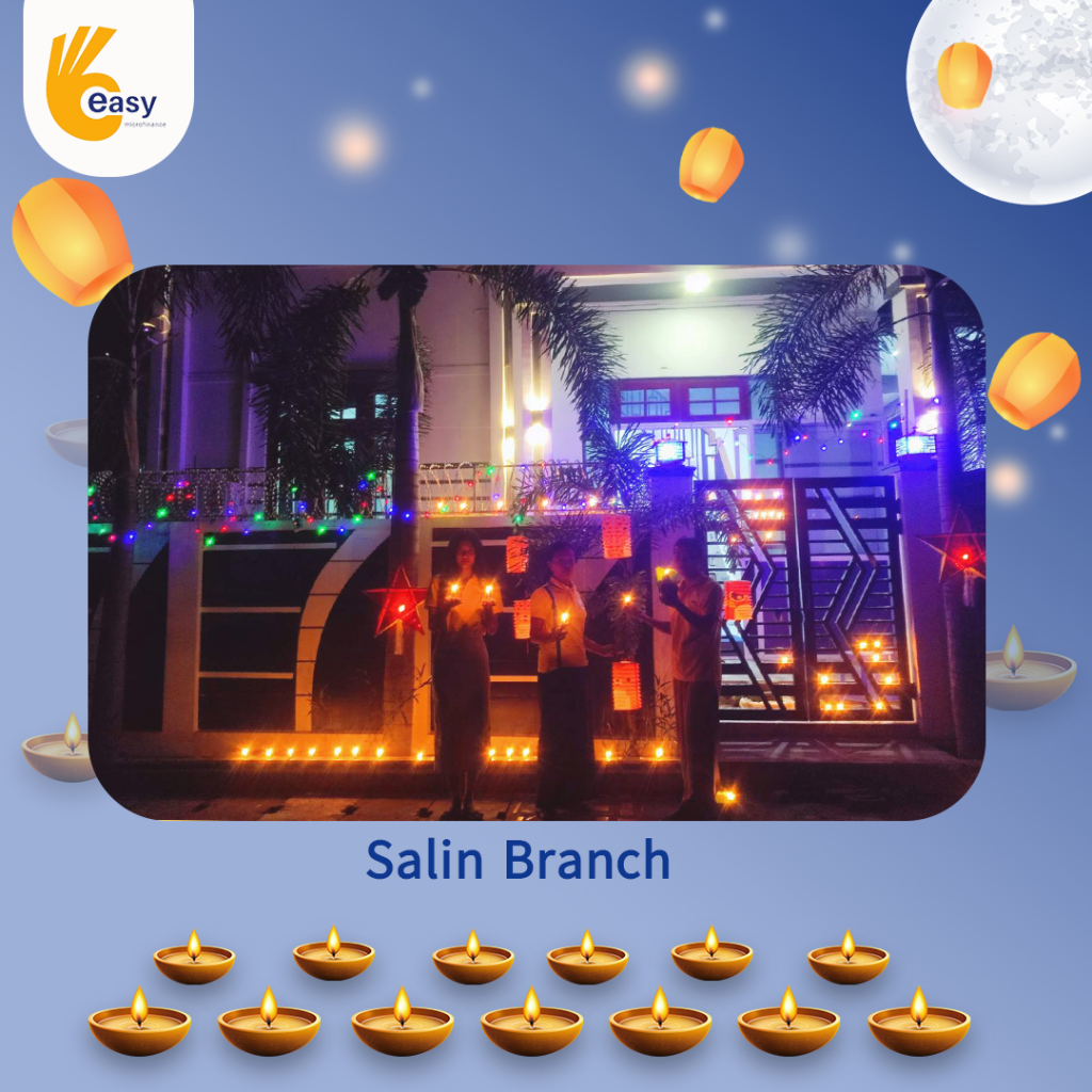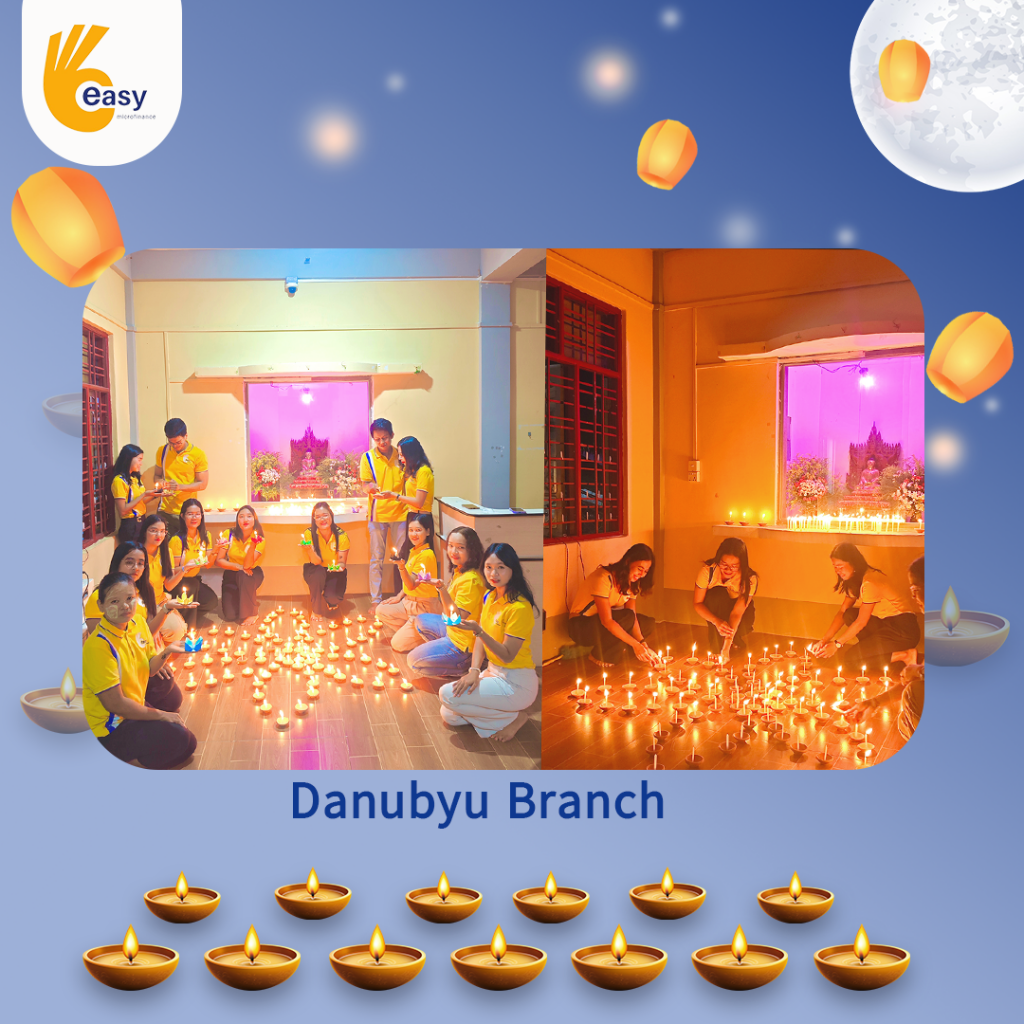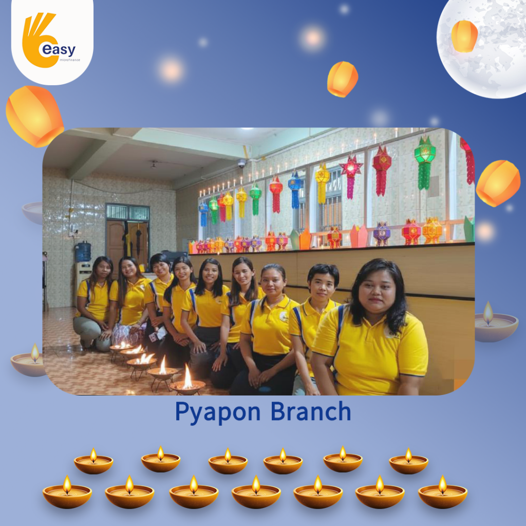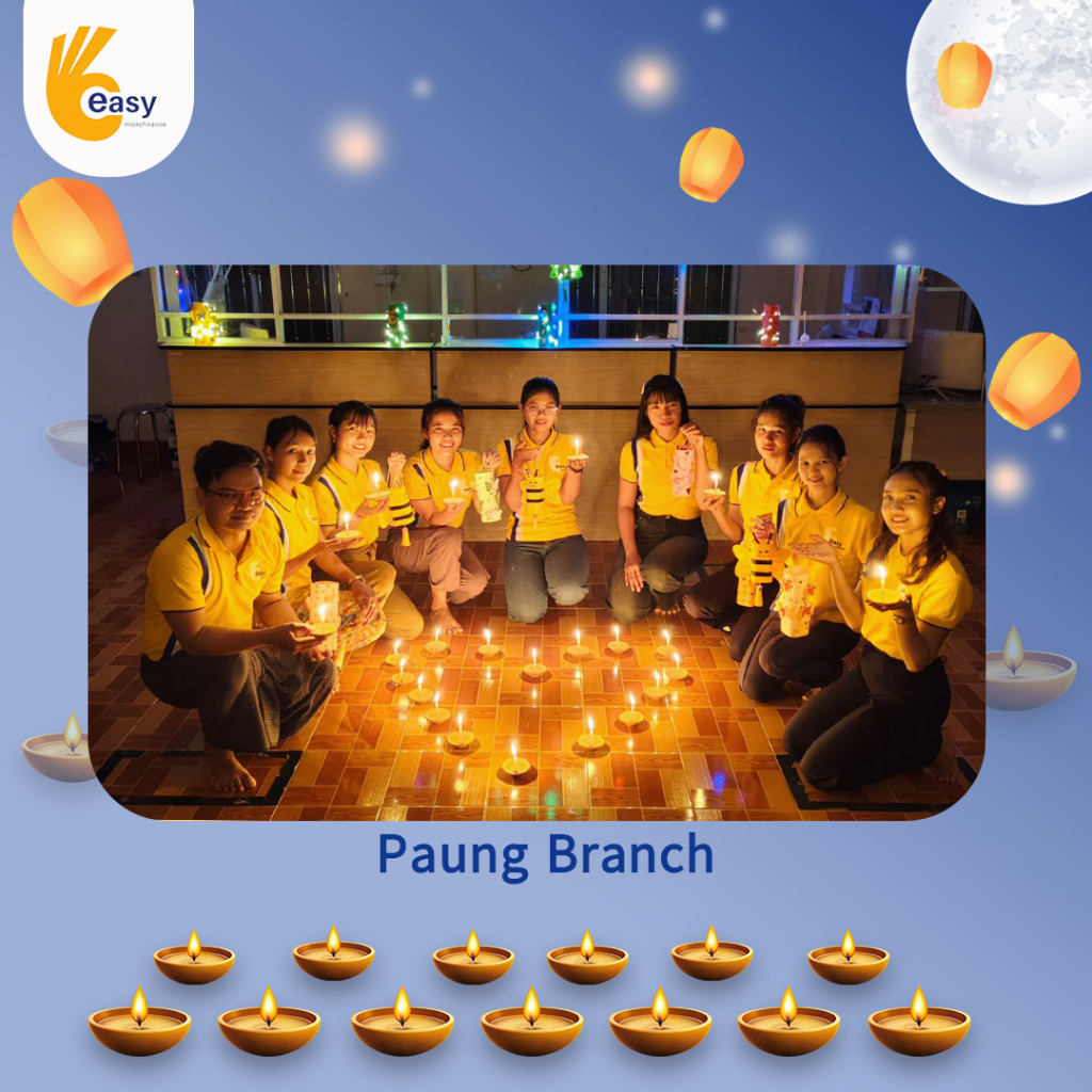 Easy Microfinance မှ စီစဥ်ကျင်းပသည့် ” ပျော်ရွှင်ဆင်နွှဲ Easy ၀န်ထမ်း များ၏ သီတင်းကျွတ်မီးထွန်းပွဲ” အစီအစဥ်လေးမှာတော့ မြန်မာနိုင်ငံအတွင်းရှိ Easy Microfinance ရုံးခွဲအသီးသီးမှ Regional Manager များ၊ Branch Manager များနှင့်အတူ ဝန်ထမ်းများမှ စုပေါင်းကာ သီတင်းကျွတ်ဆီမီးထွန်းညှိခြင်းပုံရိပ်များဖြင့် မိမိတို့၏ Branch အလိုက် အလှပဆုံးပုံဖော်ရိုက်ကူးကာ ပျော်ရွှင်စွာပါဝင်ဆင်နွှဲခဲ့ကြသည့် ပုံရိပ်များကို တင်ဆက်ပေးလိုက်ပါသည်။ အလှပဆုံး ပုံဖော်ရိုက်ကူးနိုင်သည့် ရုံးခွဲများကို ဆုလက်ဆောင်များအသီးသီး ပေးအပ်သွားမှာဖြစ်သည့်အတွက် မိမိနှစ်သက်ရာ ရုံးခွဲဓာတ်ပုံများပေါ်တွင် reacted (like & Share) ပြုလုပ်ပြီး ပါဝင်အားဖြည့်ကာ အားလုံးနှင့် ထပ်တူရင်ခုန်စွာစောင့်မျှော်အားပေးကြဖို့ တိုက်တွန်းရင်း ယခုအစီအစဥ်လေးမှာပါဝင်ခဲ့ကြသည့် ရုံးခွဲအသီးသီးမှ တာဝန်ရှိသူများနှင့်ဝန်ထမ်း များအားလုံးကိုကျေးဇူးအထူးပင်တင်ရှိပါကြောင်းနှင့် ယခုလိုသီတင်းကျွတ်အခါသမယ မှစတင်ကာ နောက်လာမည့်နေ့ရက်များမှာလည်း ပိုမိုလှပသော အခိုက်အတန့်များစွာကို ရရှိပိုင်ဆိုင်နိုင်ပါစေကြောင်း ဆုမွန်ကောင်းတောင်းအပ်ပါသည်။