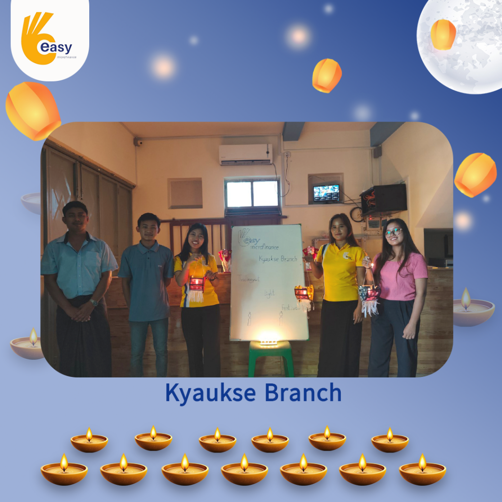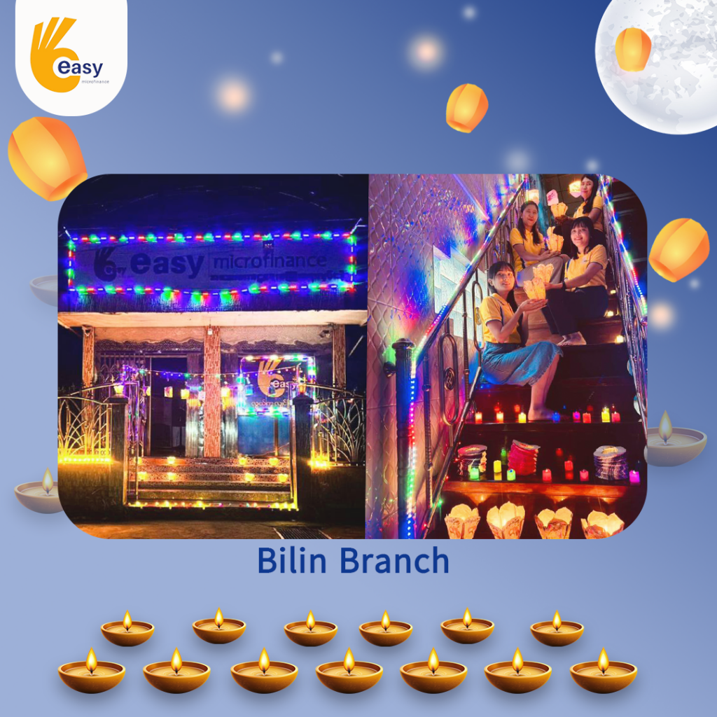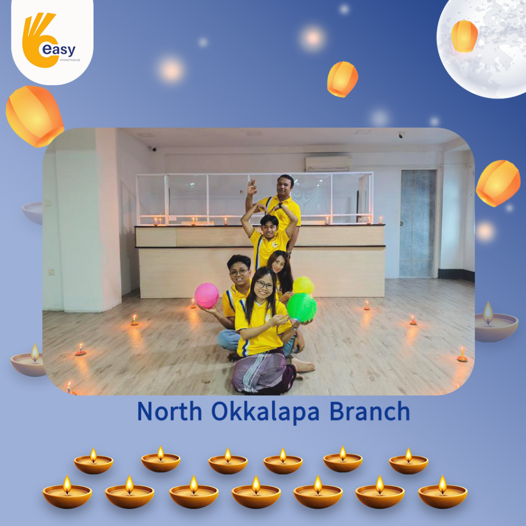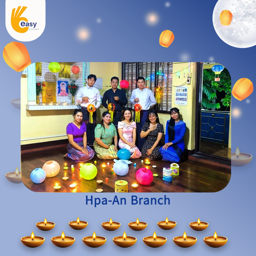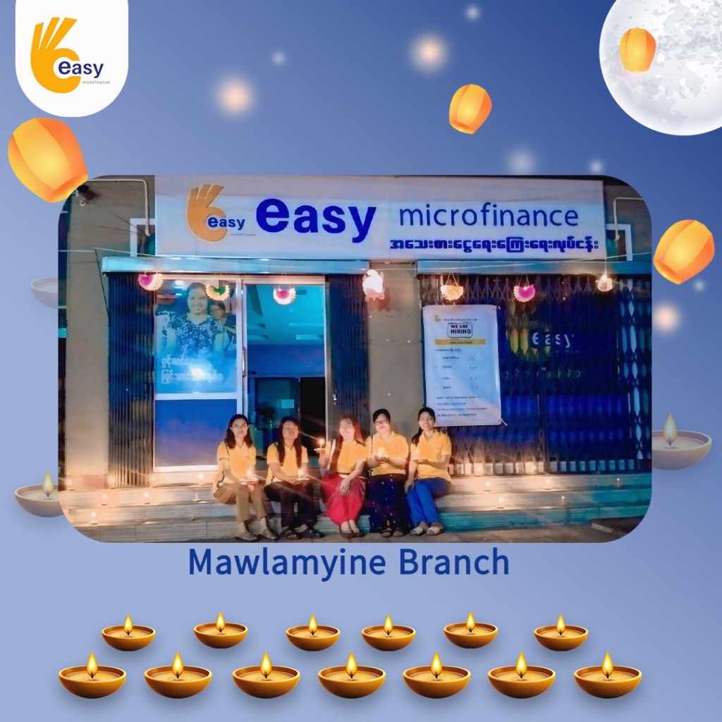 Easy Microfinance မှ စီစဥ်ကျင်းပသည့် ” ပျော်ရွှင်ဆင်နွှဲ Easy ၀န်ထမ်း များ၏ သီတင်းကျွတ်မီးထွန်းပွဲ” အစီအစဥ်လေးမှာတော့ မြန်မာနိုင်ငံအတွင်းရှိ Easy Microfinance ရုံးခွဲအသီးသီးမှ Regional Manager များ၊ Branch Manager များနှင့်အတူ ဝန်ထမ်းများမှ စုပေါင်းကာ သီတင်းကျွတ်ဆီမီးထွန်းညှိခြင်းပုံရိပ်များဖြင့် မိမိတို့၏ Branch အလိုက် အလှပဆုံးပုံဖော်ရိုက်ကူးကာ ပျော်ရွှင်စွာပါဝင်ဆင်နွှဲခဲ့ကြသည့် ပုံရိပ်များကို တင်ဆက်ပေးလိုက်ပါသည်။ အလှပဆုံး ပုံဖော်ရိုက်ကူးနိုင်သည့် ရုံးခွဲများကို ဆုလက်ဆောင်များအသီးသီး ပေးအပ်သွားမှာဖြစ်သည့်အတွက် မိမိနှစ်သက်ရာ ရုံးခွဲဓာတ်ပုံများပေါ်တွင် reacted (like & Share) ပြုလုပ်ပြီး ပါဝင်အားဖြည့်ကာ အားလုံးနှင့် ထပ်တူရင်ခုန်စွာစောင့်မျှော်အားပေးကြဖို့ တိုက်တွန်းရင်း ယခုအစီအစဥ်လေးမှာပါဝင်ခဲ့ကြသည့် ရုံးခွဲအသီးသီးမှ တာဝန်ရှိသူများနှင့်ဝန်ထမ်း များအားလုံးကိုကျေးဇူးအထူးပင်တင်ရှိပါကြောင်းနှင့် ယခုလိုသီတင်းကျွတ်အခါသမယ မှစတင်ကာ နောက်လာမည့်နေ့ရက်များမှာလည်း ပိုမိုလှပသော အခိုက်အတန့်များစွာကို ရရှိပိုင်ဆိုင်နိုင်ပါစေကြောင်း ဆုမွန်ကောင်းတောင်းအပ်ပါသည်။