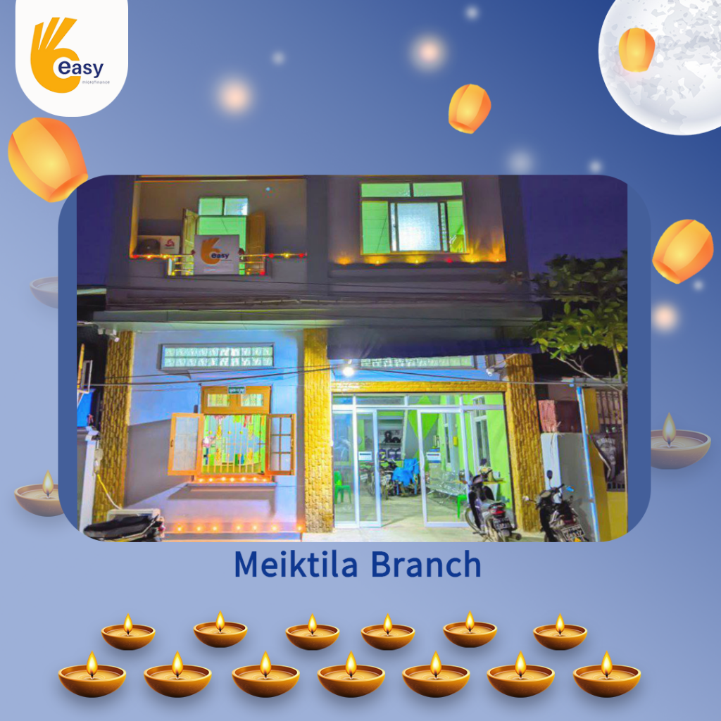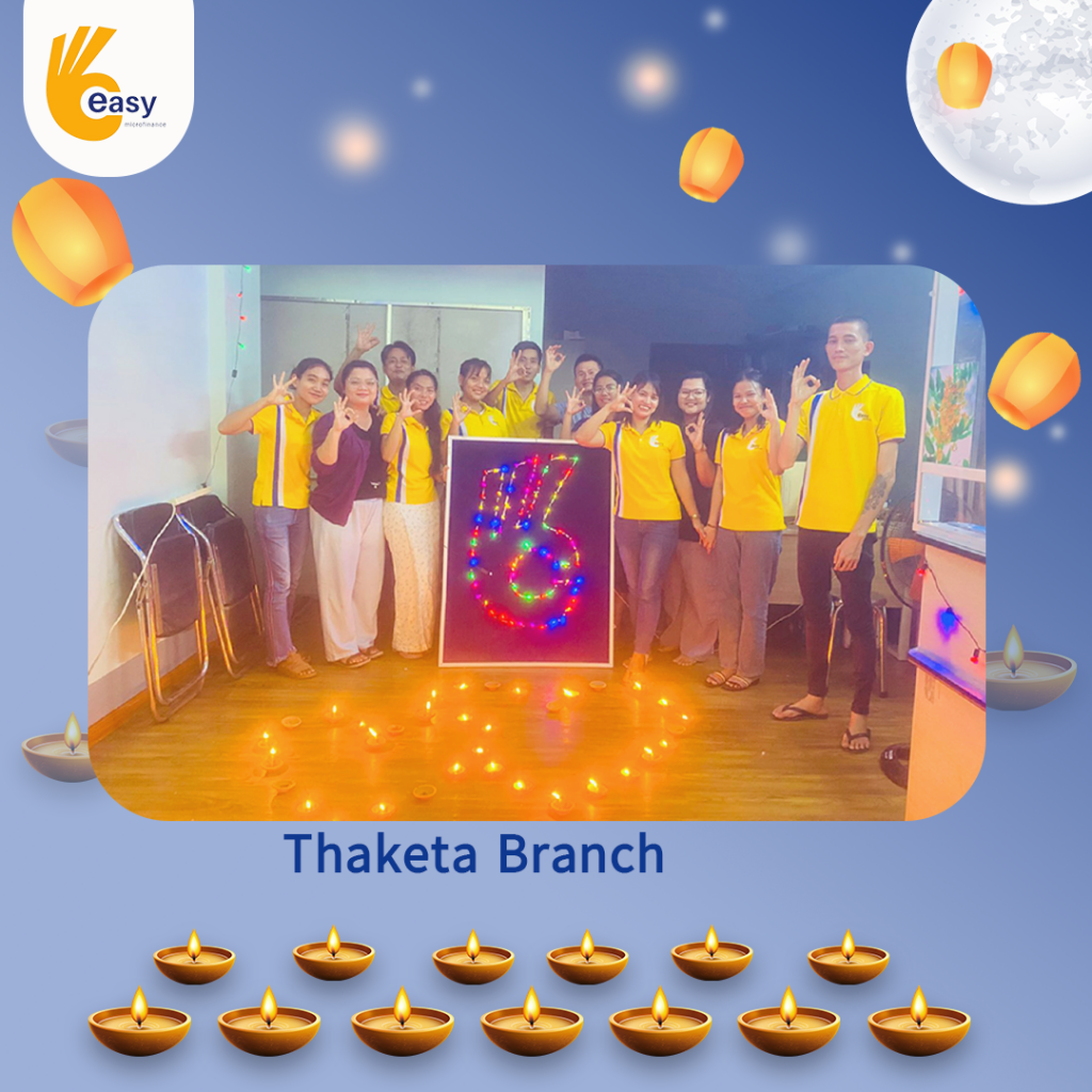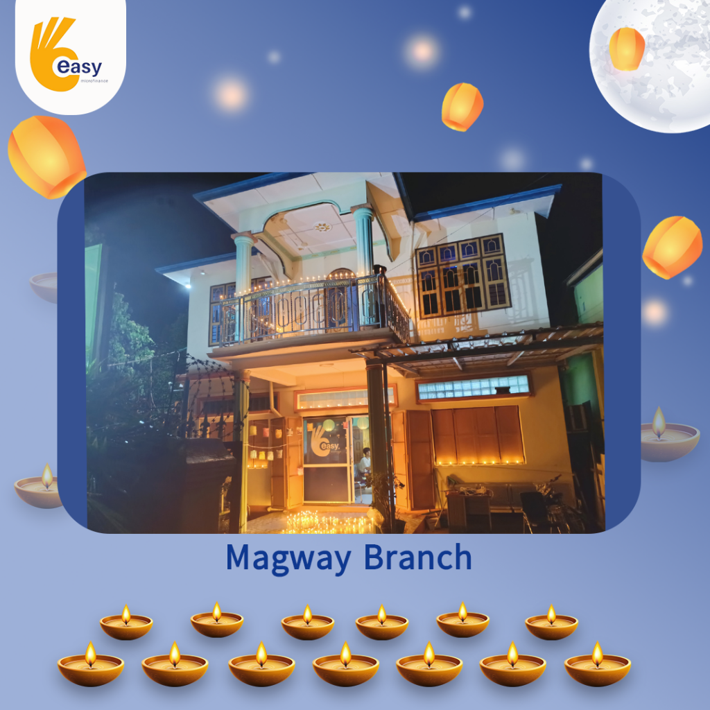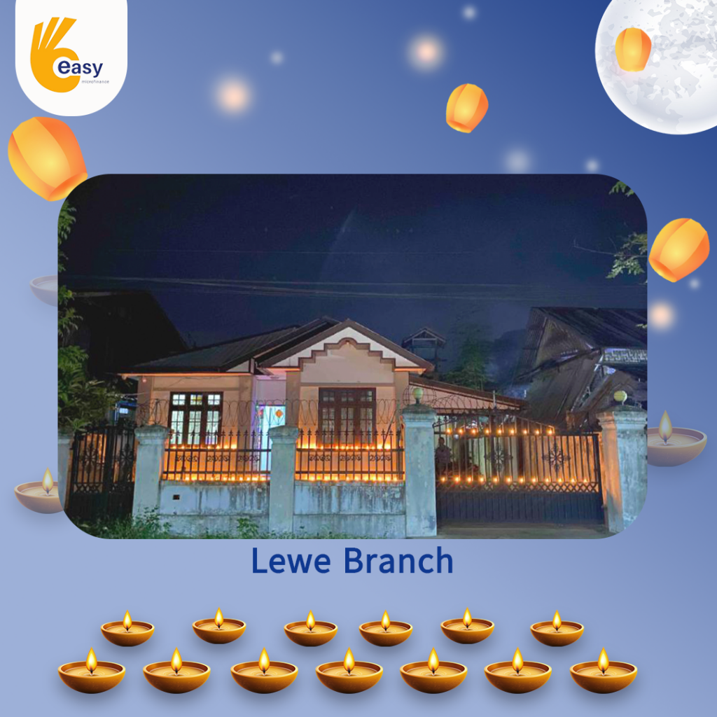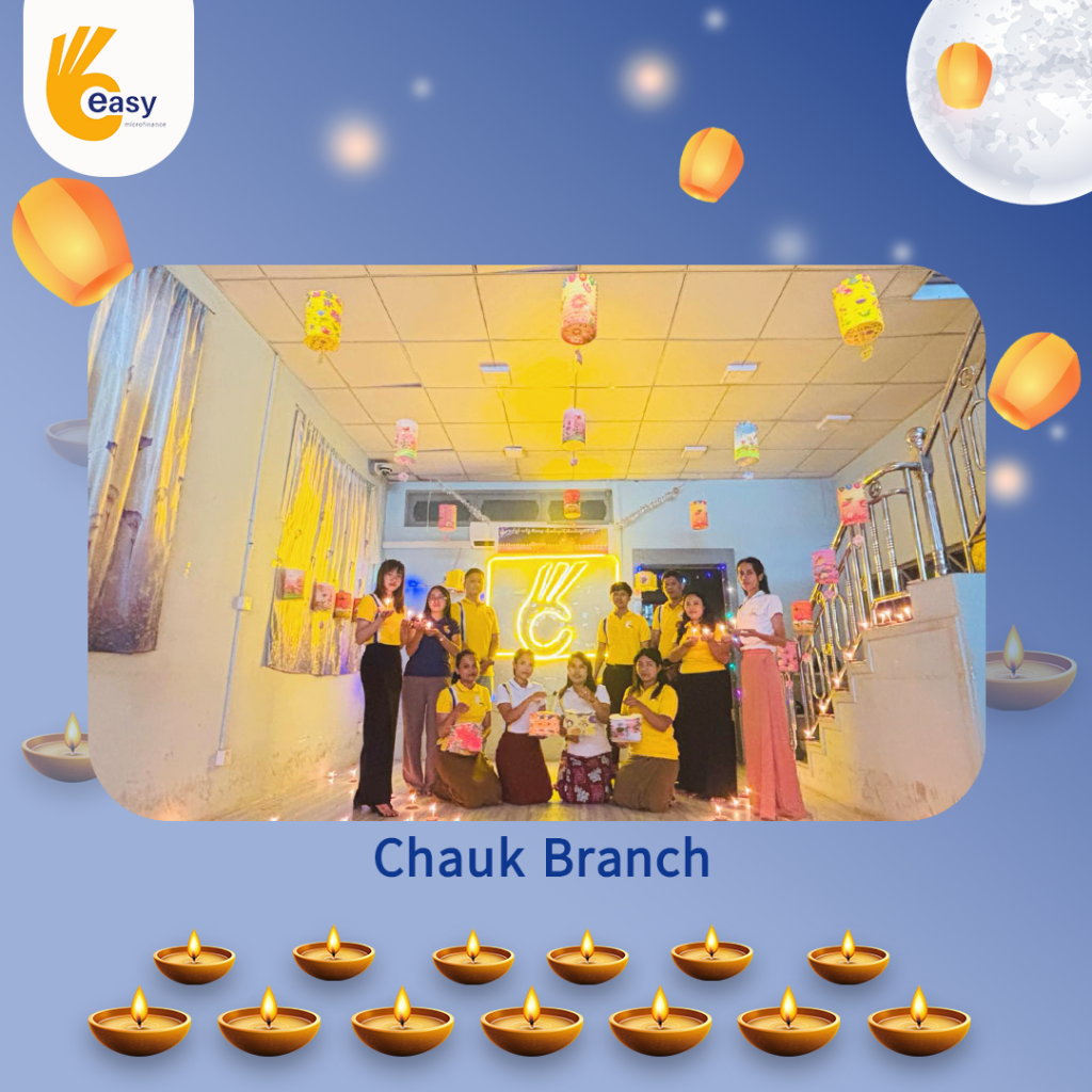 Easy Microfinance မှ စီစဥ်ကျင်းပသည့် ” ပျော်ရွှင်ဆင်နွှဲ Easy ၀န်ထမ်း များ၏ သီတင်းကျွတ်မီးထွန်းပွဲ” အစီအစဥ်လေးမှာတော့ မြန်မာနိုင်ငံအတွင်းရှိ Easy Microfinance ရုံးခွဲအသီးသီးမှ Regional Manager များ၊ Branch Manager များနှင့်အတူ ဝန်ထမ်းများမှ စုပေါင်းကာ သီတင်းကျွတ်ဆီမီးထွန်းညှိခြင်းပုံရိပ်များဖြင့် မိမိတို့၏ Branch အလိုက် အလှပဆုံးပုံဖော်ရိုက်ကူးကာ ပျော်ရွှင်စွာပါဝင်ဆင်နွှဲခဲ့ကြသည့် ပုံရိပ်များကို တင်ဆက်ပေးလိုက်ပါသည်။ အလှပဆုံး ပုံဖော်ရိုက်ကူးနိုင်သည့် ရုံးခွဲများကို ဆုလက်ဆောင်များအသီးသီး ပေးအပ်သွားမှာဖြစ်သည့်အတွက် မိမိနှစ်သက်ရာ ရုံးခွဲဓာတ်ပုံများပေါ်တွင် reacted (like & Share) ပြုလုပ်ပြီး ပါဝင်အားဖြည့်ကာ အားလုံးနှင့် ထပ်တူရင်ခုန်စွာစောင့်မျှော်အားပေးကြဖို့ တိုက်တွန်းရင်း ယခုအစီအစဥ်လေးမှာပါဝင်ခဲ့ကြသည့် ရုံးခွဲအသီးသီးမှ တာဝန်ရှိသူများနှင့်ဝန်ထမ်း များအားလုံးကိုကျေးဇူးအထူးပင်တင်ရှိပါကြောင်းနှင့် ယခုလိုသီတင်းကျွတ်အခါသမယ မှစတင်ကာ နောက်လာမည့်နေ့ရက်များမှာလည်း ပိုမိုလှပသော အခိုက်အတန့်များစွာကို ရရှိပိုင်ဆိုင်နိုင်ပါစေကြောင်း ဆုမွန်ကောင်းတောင်းအပ်ပါသည်။